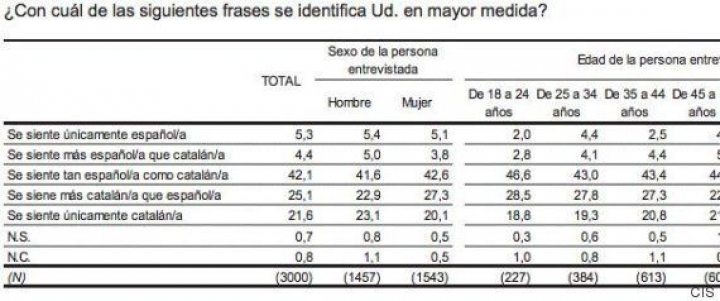 Por otro lado, la mayoría de los encuestados (el 42,1%) se sienten tan españoles como catalanes, mientras que el 25,1% dice sentirse más catalán que español y el 21,6% asegura que sólo se siente catalán. En el otro extremo, únicamente el 5,3% afirma sentirse únicamente español y el 4,4% más español que catalán.