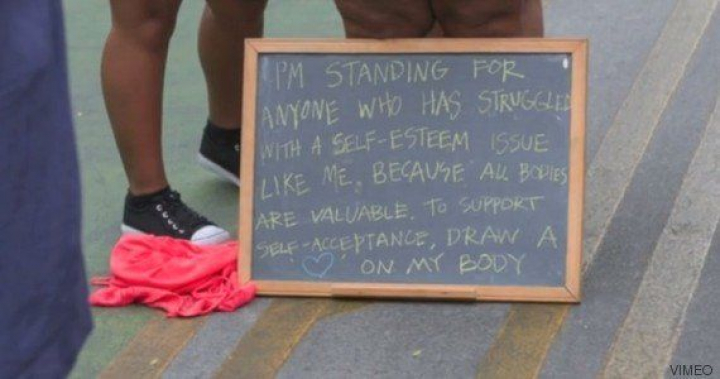 En ropa interior y con un cartel a sus pies, pedía a los transeúntes que la apoyaran en su acto de "autoaceptación radical" pintando en su cuerpo un corazón con uno de los rotuladores que había llevado a su curiosa performance. En una entrevista a la CNN, ha explicado que se sintió robustecida cuando enseñó a todos sus "imperfecciones" y cuando vio que podía afrontar ese liberador destape.