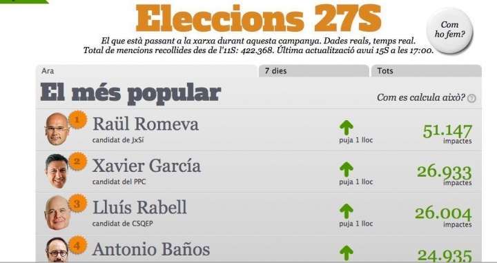 Es el que ha dejado la web "Elecciones 27s", según la cual el candidato de Junts pel Sí a la Generalitat, Raül Romeva, es el cabeza de lista que suscita más comentarios en Internet. Nada más y nada menos que un total de 52.141 impactos. Esta web sigue a tiempo real la incidencia de cada uno de los candidatos en la Red, incluyendo medios online, redes sociales y blogs, a partir de los impactos detectados desde el 11 de septiembre.