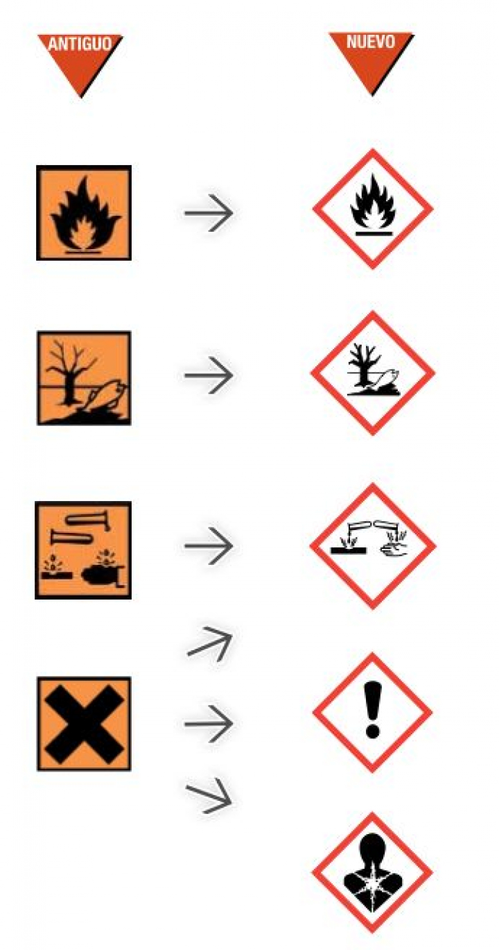 A partir de ahora, el aspa se sustituye por un signo de exclamación y/o la silueta de un hombre, y los dibujos cambian de forma (antes eran cuadrados y ahora son unos cuadrados inclinados 90 grados) y el color (de naranjas pasan a ser rojos con el fondo blanco). La regla es sencilla: cuando veamos los nuevos signos (exclamación y silueta) se nos tiene que encender la alarma. Indican que el producto en cuestión puede producir irritación o sensibilización cutánea, irritación ocular grave e intoxicación en caso de ingestión.
