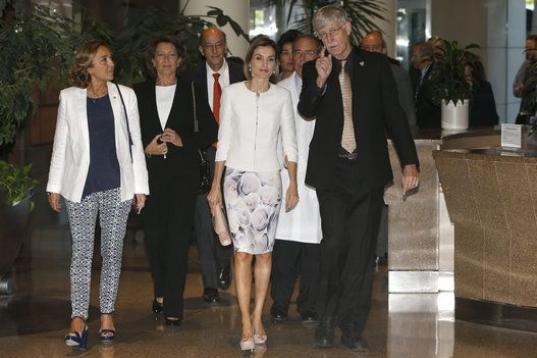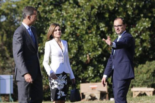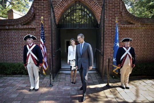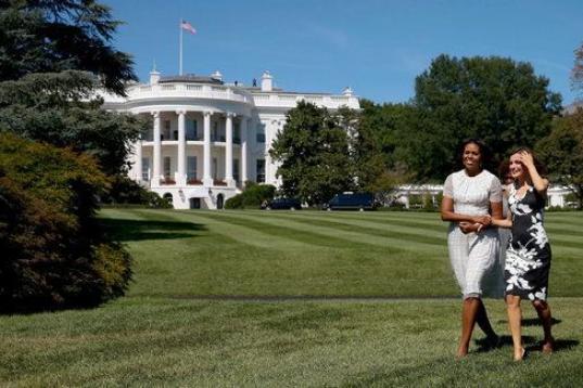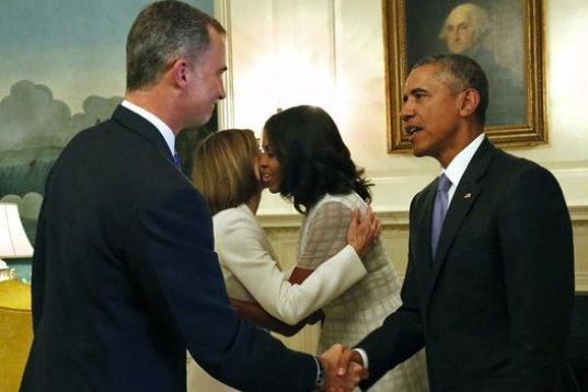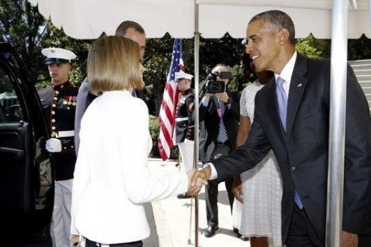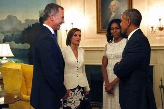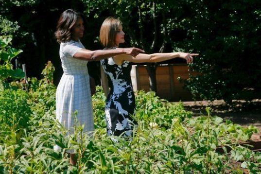 La visita ha coincidido con el 43º cumpleaños de la reina. Tras los protocolarios saludos y posados, y mientras el rey y el presidente estadounidense departían, Michelle le ha ofrecido un té a la reina Letizia (con chaqueta blanca y vestido negro de Felipe Varela, bolso de Hugo Boss, zapatos de Prada y pendientes de Tous), y la ha llevado a pasear por su huerto ecológico, una de las principales labores de la primera dama en la Casa Blanca. Así lo contó ella misma en Twitter.