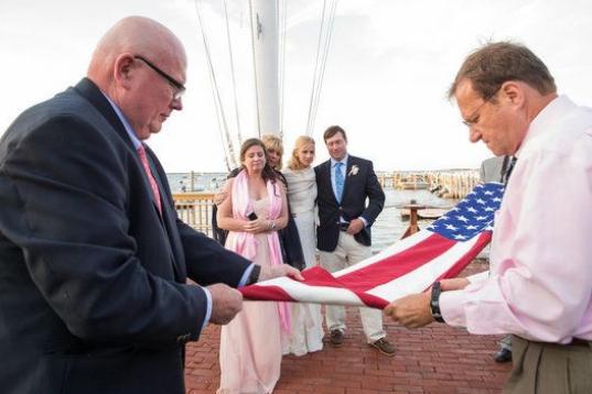 "El padre del novio falleció once años antes. Ellos hicieron ondear la bandera que ganó por ser un veterano de la Marina durante el banquete. Justo al atardecer, todos se reunieron mientras la novia, el novio y otros familiares cercanos la ar...
