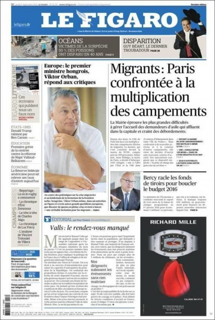 El presidente húngaro, Víctor Orbán, defiende su postura en una entrevista en Le Figaro en la que argumenta: "Discutir de cuotas en este momento es una invitación para los migrantes". Orbán rechaza hablar de refugiados, y en Alemania, el conservador Die Welt destaca los casos de picaresca, como la obtención por un periodista de un pasaporte sirio por 750 euros con la foto del primer ministro de Holanda.