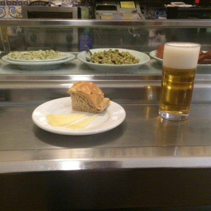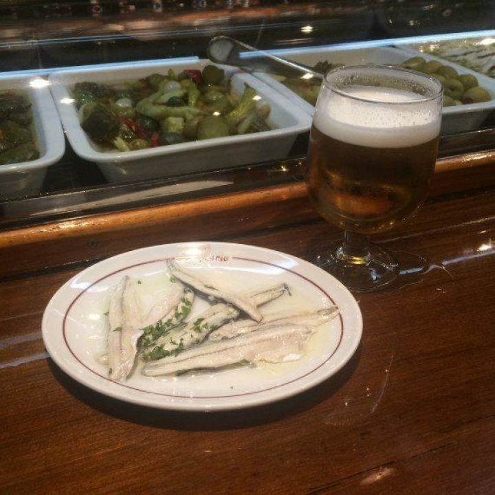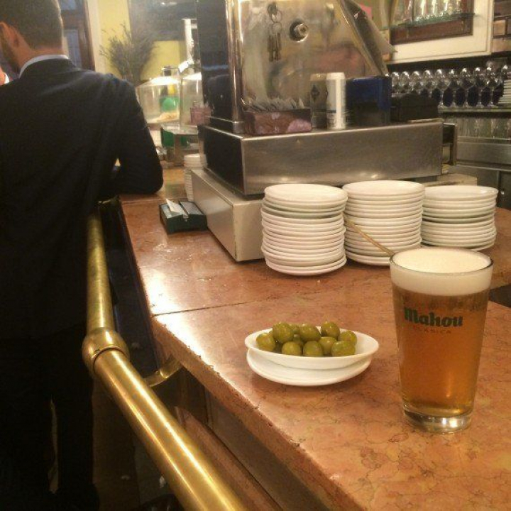 En su barra a la entrada te sirven un doble bien frío acompañado por un plato de boquerones en vinagre. Mientras degustas la cerveza se puede observar cómo un cortador de jamón no para durante toda la noche. Los platos del jamón Cinco Jotas vuelan sobre tu cabeza. Políticos, periodistas, empresarios y muchos guiris cruzan constantemente la puerta. En su pequeña barra también algunos clientes suelen degustar vermú y un buen vino. Muchos no resisten ahí más de unos minutos e intentan conseguir una mesa dentro. Un lugar castizo especial en el que sus camareros de chaquetas blancas han escuchado muchos secretos (de Estado).