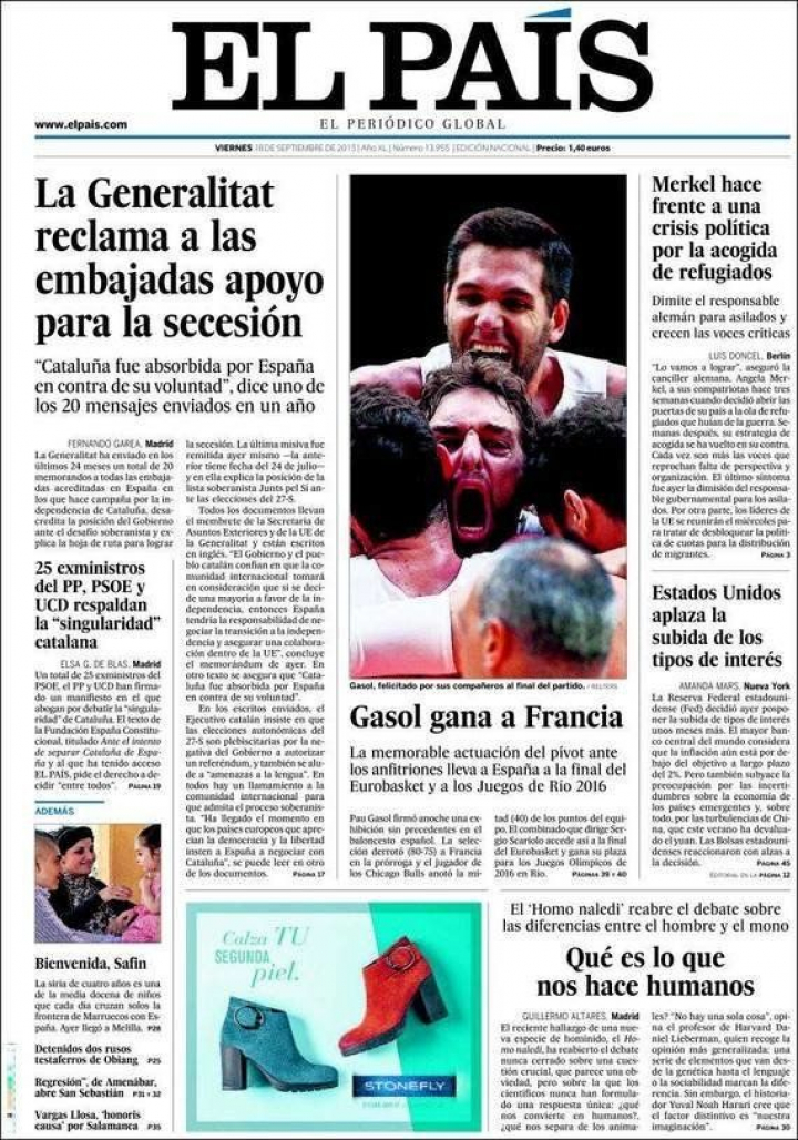 "Cataluña fue absorbida por España en contra de su voluntad", señala uno de los 20 mensajes enviados en un año por la Generalitat de Cataluña a las Embajadas en España "reclamando el apoyo a la secesión", concluye El País, que acoge una tribuna de Antonio Elorza en la que acusa a Mas y Junqueras de haber "acuñado un relato lleno de simplificaciones y falsedades" en torno al lema central de "España contra Cataluña".