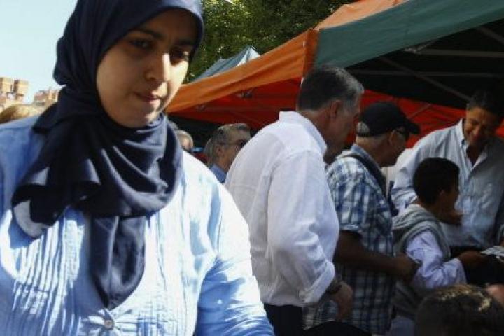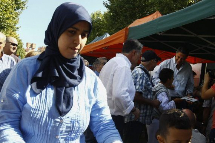 Una mujer musulmana pasa ante García Albiol, de fondo, en su visita al barrio de Cerdanyola de Mataró.
