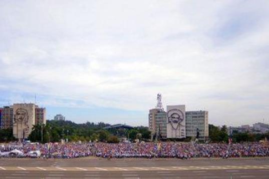 La referencia destacó precisamente por ser este el lugar en el que se concentran símbolos que en Cuba son los pilares ideológicos básicos del régimen cubano, al pie del monumento al líder independentista José Martí, y que La Habana utiliza frecuentemente como escaparate de su apoyo entre las masas.