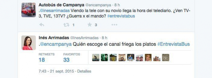 La cuenta de Twitter @encampanya ha logrado este lunes que Inés Arrimadas (C's) se soltara un poco la melena y demostrara que, cuando quiere, saber dar un buen corte, pero con educación. El perfil de esta red social que triunfa en la campaña le ha preguntado: "No nos casamos con nadie. Hasta hoy. ¿A quién debemos pedir su mano?". Ella ha contestado virtualmente: "¿Le pides a todas matrimonio en la primera entrevista? ¡Este autobús va sin frenos!", y ha esquivado una pregunta incómoda sobre su pareja, supuestamente soberanista: "@encampanya quería saber si es ella o su compañero quien elige si ven el informativo en TV3, TVE o 13TV", a lo que ella ha respondido: "Quien escoge el canal friega los platos".