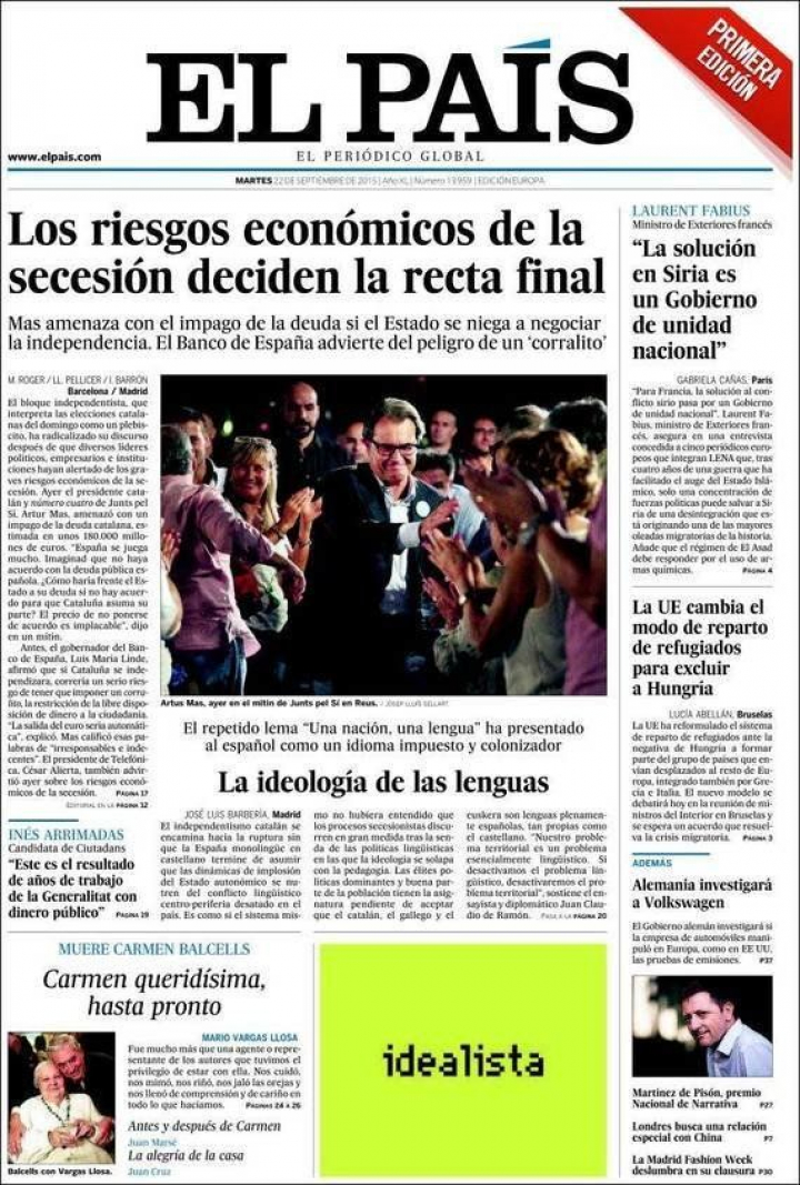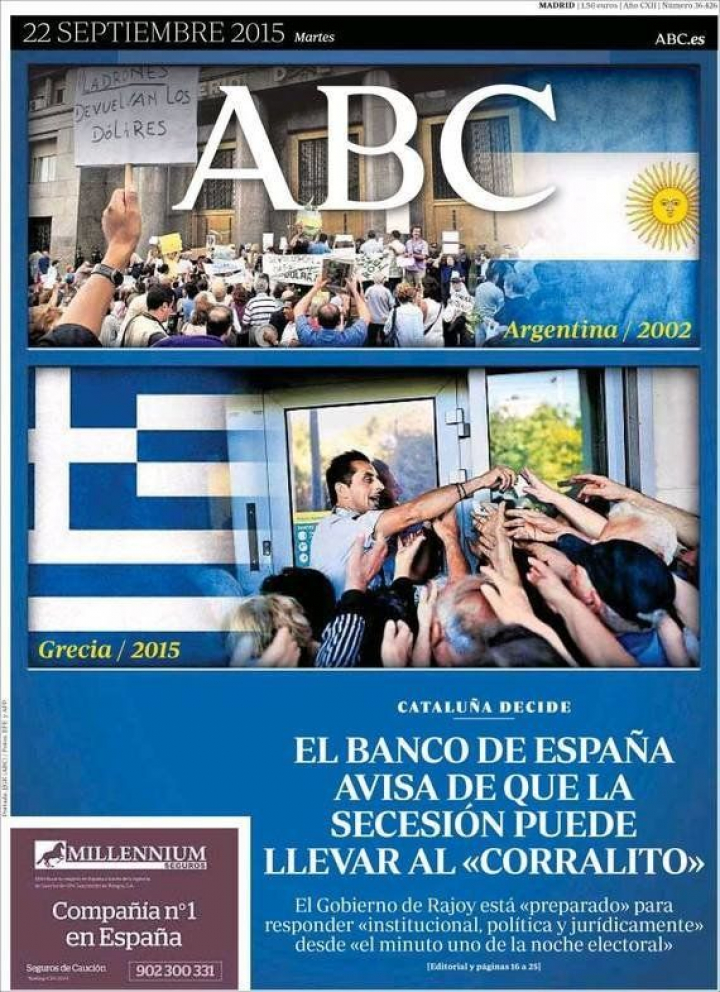 "La alerta del corralito enciende la campaña", constata a toda página El Periódico, y La Vanguardia destaca la advertencia que, a su vez, hizo Artur Mas: "El Estado no podrá pagar la deuda sin acuerdo". Para El País, la reacción del president es "más demagogia" y advierte que "el coste de la independencia irrumpe del peor modo en la campaña catalana".