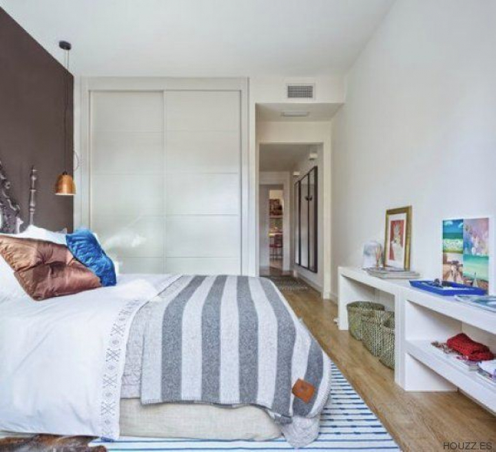 Los armarios que coloquemos en la habitación, si no dispones de una estancia específicamente destinada a este uso, también requerirán un estudio a fondo para optimizar al máximo su ubicación y capacidad de almacenaje. Si la habitación es de dimensiones reducidas, procura colocar armarios con puertas correderas, ahorrarás el espacio que necesitas para abrir las puertas convencionales. Además, es aconsejable que los sitúes relativamente alejados de la puerta de acceso para evitar que el paso se vea entorpecido.