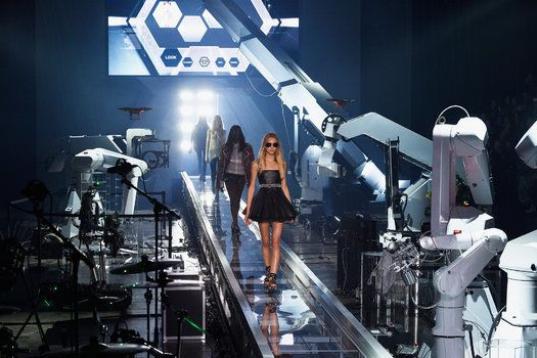 Para rizar el rizo, el espectáculo se completó con un pequeño concierto de Courtney Love, que salió por la robotizada pasarela. Y ahí se vio el truco que ésta escondía: las modelos (y la propia) cantante no tenían que caminar sobre ella sino que directamente se deslizaban. Ideal para evitarse torceduras de tobillo y los malditos tropezones.