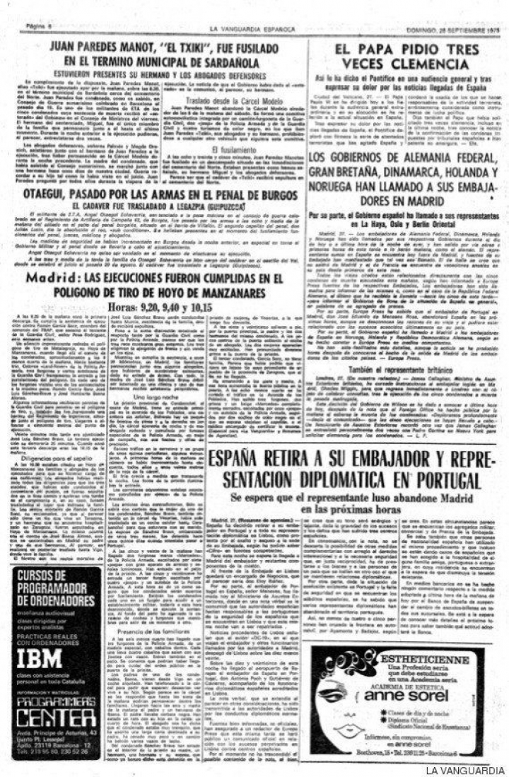 Nada ablandó el alma del dictador. Ni la presión internacional -de gobiernos europeos y americanos, del Vaticano, de la ONU, de intelectuales franceses como Jean Paul Sartre- ni el clamor de las familias. En la mañana del 27 de septiembre de 1975 cinco hombres morían fusilados, los últimos cinco asesinados por el régimen de Francisco Franco. No hubo más balas, pero el Estado -ya sin el fascista- no anuló la pena de muerte hasta 1978.