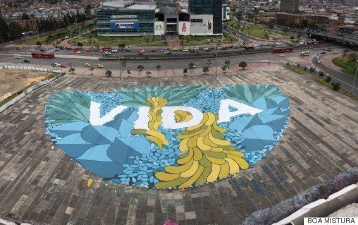 Esta obra formaba parte de un proyecto para realojar en viviendas del centro de la capital a familias desplazadas por la guerra interna procedentes de todos los puntos del país. "Tienen que aprender a convivir con gente de otras culturas, con otra alimentación, habla... y tienen que empezar a generar una identidad", explica Serrano. Así que finalmente pintaron una hoja formada por "hojitas distintas de todos los ecosistemas que hay en Colombia" con una gran palabra en el medio: vida.