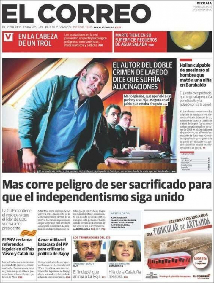 Por eso, siempre es bueno mirar la situación con perspectiva. Desde Euskadi, por ejemplo, El Correo redacta un certero titular: "Mas corre peligro de ser sacrificado para que el independentismo siga unido". El president, cuya investidura depende de una CUP, que, según La Razón, "apoyará a Romeva", es la diana de todos los comentarios.