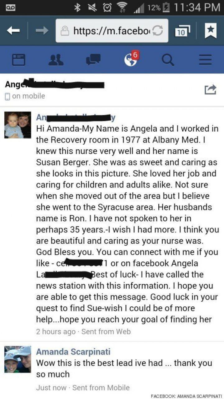 No se equivocaba, apenas un día después de publicar la imagen, que se compartió más de 1.400 veces por Facebook, Scarpinati recibió una respuesta. Una mujer llamada Angela y que trabajó en el mismo hospital donde fue tomada la imagen, reconoció a la enfermera: "Se llama Susan Berger", le informó.