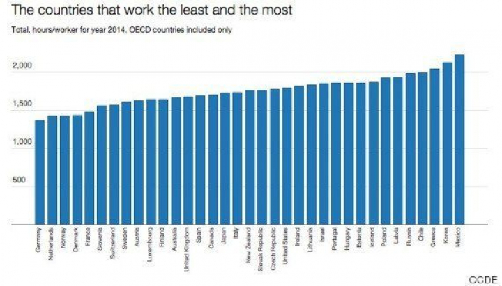 La medida ha reabierto el debate sobre cuántas horas hay que trabajar y ha hecho que la Organización para la Cooperación y el Desarrollo Económicos (OCDE) reviva en su web la última estadística que tiene al respecto, de 2014. Sus estadística dicen que los empleados que más horas echan entre los 34 países miembros de este organismo son los mexicanos, con 2.228 horas por año, mientras que a la cabeza de Europa están los griegos, con 2.042.