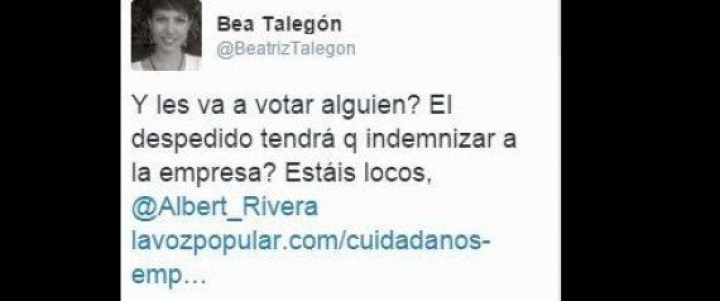 Beatriz Talegón ha vuelto a meterse en un jardín en Twitter. La exsocialista publicó este jueves un enlace a la web satírica La Voz Popular, de contenidos falsos, en la que se aseguraba que Ciudadanos propondrá que las empresas puedan reclamar a los trabajadores que despidan a devolver los salarios cobrados en algunos casos.