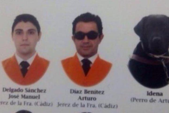 La orla de la promoción 2014-2015 del grado en Trabajo Social de la Universidad de Cádiz se ha convertido en el último fenómeno viral en España. Y la culpa es de Idena, una preciosa perra, lazarillo de uno de los licenciados, Arturo Díaz, a quien se ha incluido en la tradicional foto final de carrera porque, como todos los demás, ha estado cada día en clase durante los cuatro años de formación. Es una más y como tal se lo merece. Hasta birrete han llegado a ponerle... Es una más, haya o no pasado los exámenes.