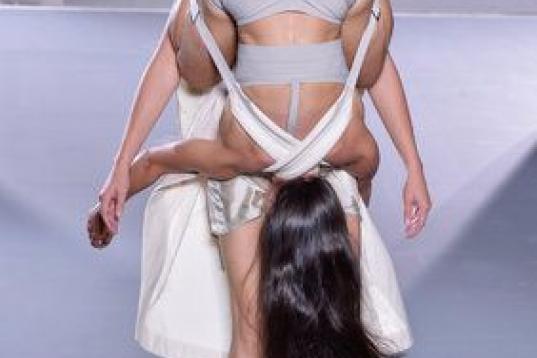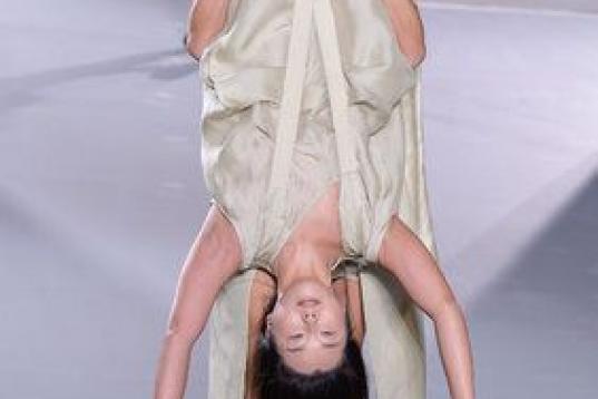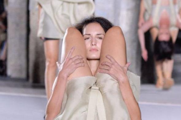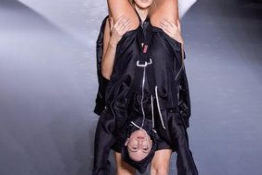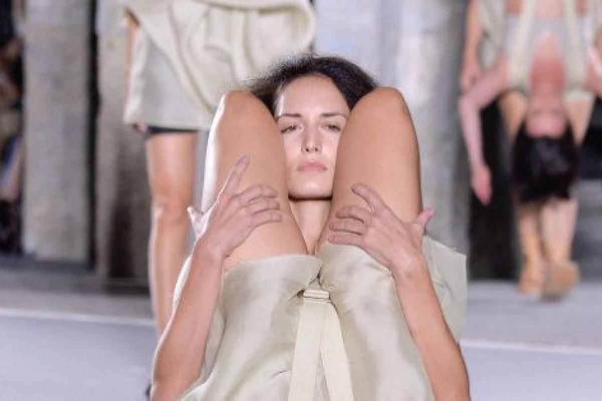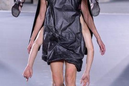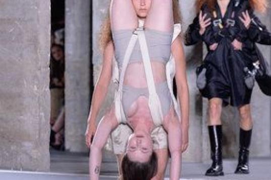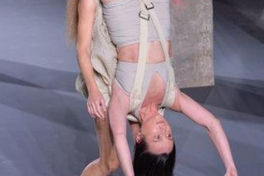 Son mujeres vestidas con... esto... pues con otras modelos encima. Como si fueran un fardo, una mochila, una cría de canguro... Top models cargadas con otras top models. Es la propuesta de Rick Owens, un diseñador considerado un niño terrible, al que le encanta provocar, y que se ha podido ver en la Semana de la Moda de París.