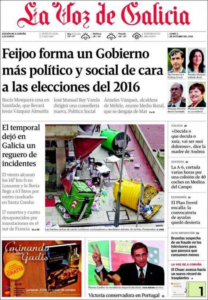 "Feijóo forma un gobierno más político y más social de cara a 2016", resume en primera La Voz de Galicia. Más político, nos aclara el Diario de Pontevedra, porque recurre al poder local, al incluir a varios alcaldes como nuevos consejeros, y enmienda así el gabinete de técnicos con el que venía gobernando.