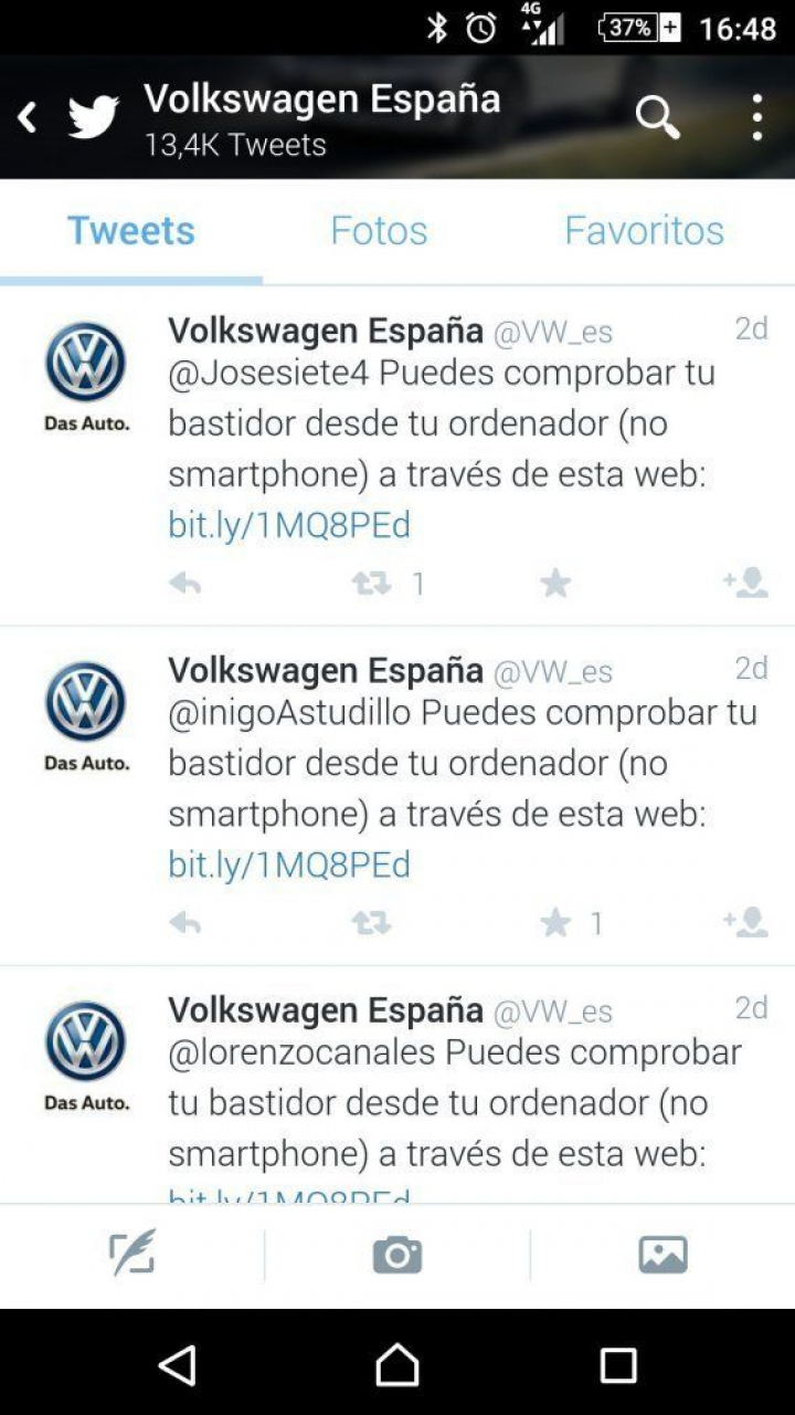 Los usuarios denuncian que la compañía responde con un mensaje casi automático en Twitter en el que dice que puede comprobar si el coche está afectado a través del número de bastidor. Y Facua hizo la prueba de llamar al número de información, donde se encontró con una teleoperadora que desconocía cuándo se pondrá la empresa en contacto con el cliente y si la intervención que van a hacer a los vehículos afectados provocará que pierdan potencia.