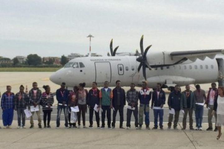 Tras subir las escalerillas del avión, los 19 eritreos se despidieron desde la puerta de la nave que les llevará a Suecia, a la ciudad de Lulea, a poca distancia del círculo polar ártico.