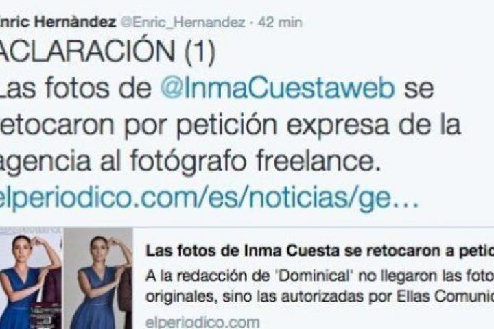 El director de El Periódico de Cataluña, Enric Hernàndez, ha pedido disculpas a Inma Cuesta por el exceso de retoque que mostraban las fotos de la actriz publicadas hoy en el suplemento dominical del diario.