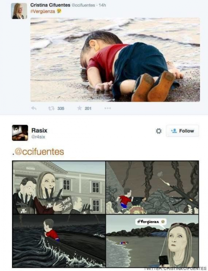 Entonces muchos mostraron su dolor e indignación ante lo que estaban viendo. Una de esas personas fue la presidenta de la Comunidad de Madrid, Cristina Cifuentes, que publicó en Twitter la fotografía acompañada de una palabra: "Vergüenza". Entre las respuestas que recibió la dirigente madrileña, este pequeño cómic fue una de las más compartidas: