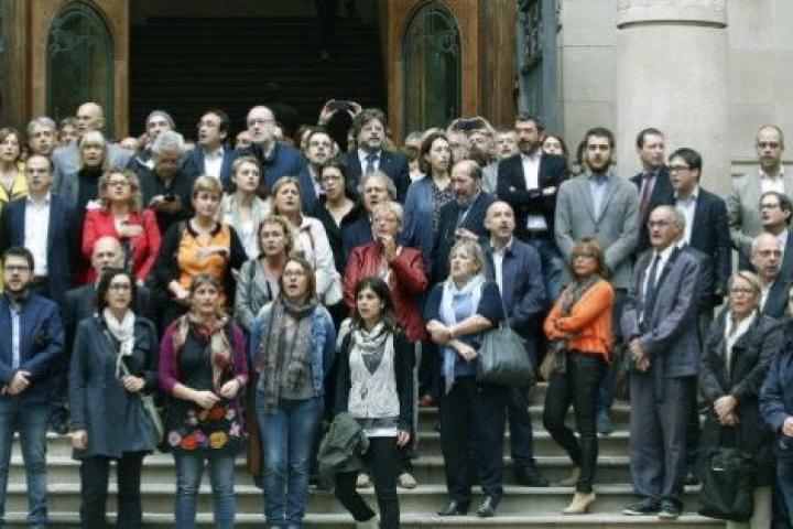 Los miembros del Govern, salvo el presidente en funciones Artur Mas, diputados de Junts pel Sí (CDC y ERC) y de la CUP, entre ellos Antonio Baños, han acompañado a la consellera de Enseñanza en funciones, Irene Rigau, hasta la puerta del Tribunal Superior de Justicia de Cataluña, donde hoy declara imputada por la consulta del 9-N.