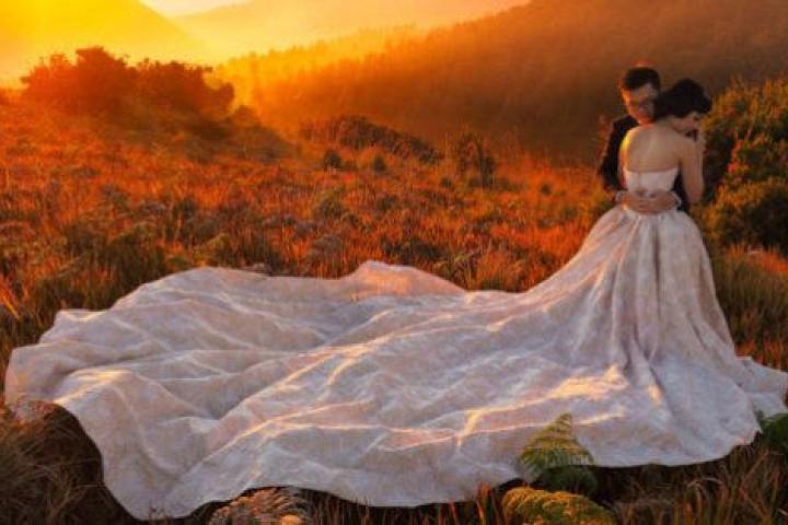 "La luz dorada del atardecer derramándose sobre esta adorable pareja da a la escena un aire suave y romántico. No es sólo un bonito retrato de la pareja, es una maravillosa exhibición de la cola del vestido. Desde la luz, hasta el estilo y l...