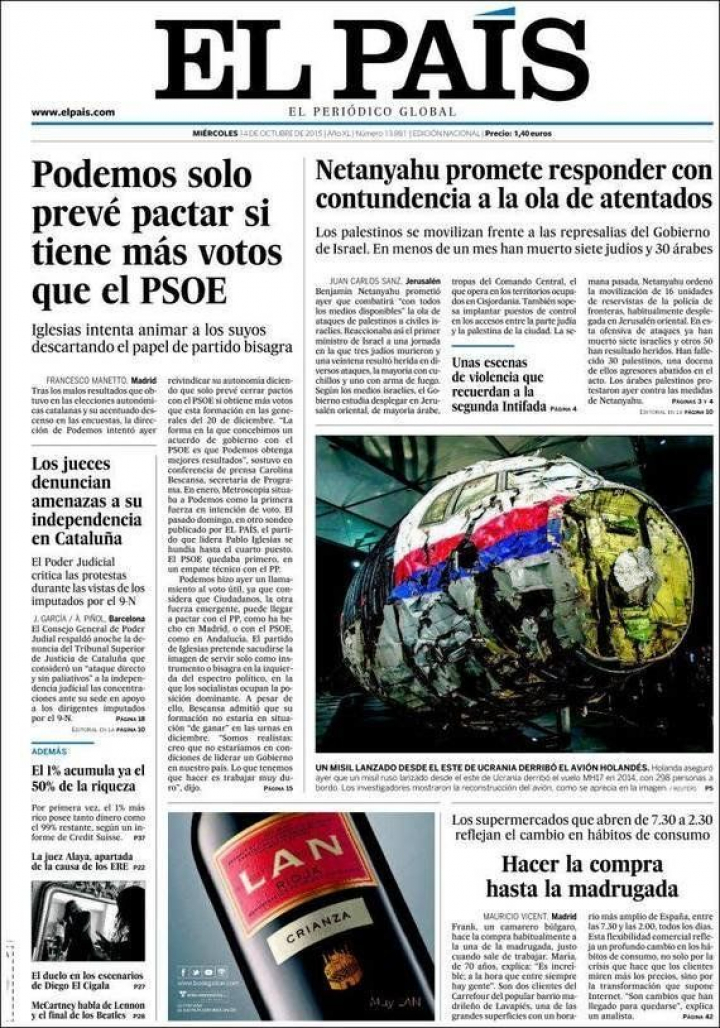 La Razón explica que "el PP vasco asume la marcha de Quiroga, aunque Cospedal intenta pararla". Así las cosas, "Podemos solo prevé pactar si tiene más votos que el PSOE", explica El País. Se trata del cambio de estrategia de Iglesias que, al descartar el papel de partido bisagra, intenta animar a los suyos.