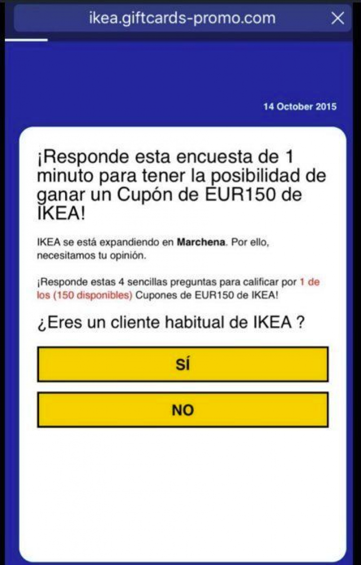 "IKEA no tiene nada que ver con esta comunicación fraudulenta en la que se invita a los usuarios a realizar una encuesta a cambio de un premio económico (vale de 150 euros de compra en IKEA). IKEA no ofrece a los clientes, ni de forma directa ni a través de terceros, ningún cupón regalo premiando la participación en encuestas. Ya lo hemos reportado a nuestro departamento legal y la Policía, por su parte, está difundiendo una alerta, puesto que el intento de fraude afecta a varias marcas".