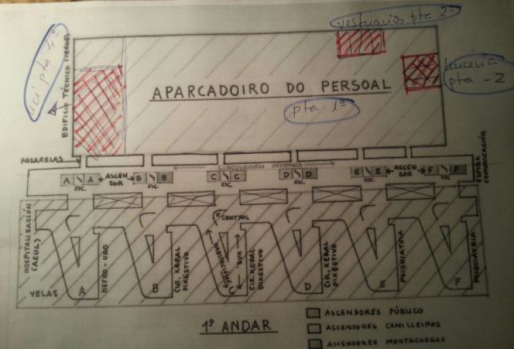 Y las quejas de los trabajadores siguen. Afirman que la estructura del hospital hace que haya distancias enormes que provocan que la movilidad de los pacientes sea muy complicada. Una enfermera del centro, que prefiere no dar su nombre, afirma que tiene que caminar cerca de un kilómetro para ir desde el vestuario a su puesto de trabajo. Lo explica con este dibujo: