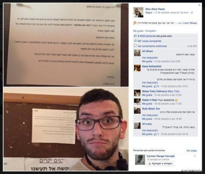 El joven, de casi 28 años y residente en Tel Aviv -la capital de Israel-, se vio sorprendido cuando encontró en el tablón de su bloque un papel en el que alguien decía que no era muy seguro tener a un árabe en el edificio, ante la revuelta violenta que estos días se vive en la zona. El mensaje, en hebreo, decía más o menos así: