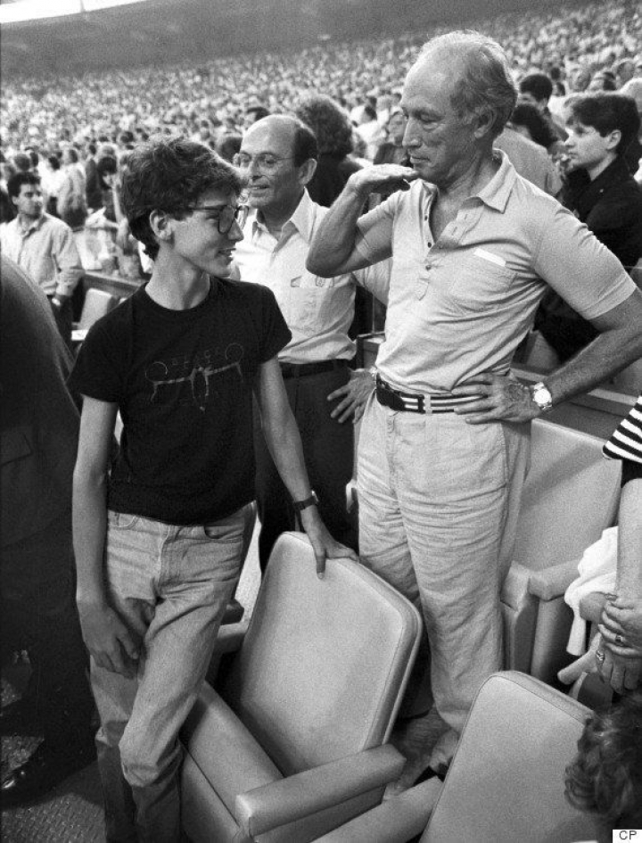 El ex primer ministro Pierre Trudeau muestra cuánto ha crecido su hijo Justin durante los Expos de Montreal el 20 de abril de 1987. Paul Chiasson/The Canadian Press