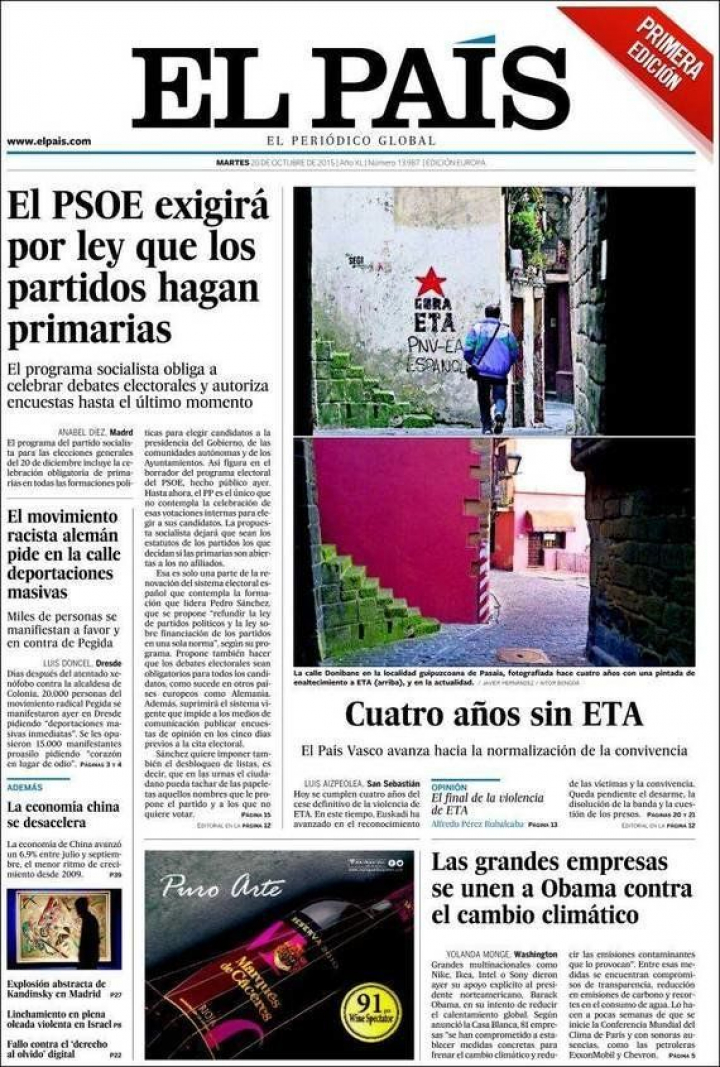 "Cuatro años sin ETA", constata en primera página El País con dos fotos de la misma calle de la localidad de Pasaia: una pintada de enaltecimiento de ETA ha desparecido.