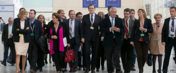 Eso se lleva bajo el brazo Rajoy, que saltará a la pista este jueves para clausurar el congreso. Eso sí, ya ha calentado el ambiente este miércoles y ha atendido a la prensa por sorpresa. El líder del PP ha llegado al Palacio Municipal de Congreso rodeado no solo por el ‘trío La La La’, sino por los Mocedades del PP. Incluso uno puede soñar con que en ese momento sonaba Eres tú. Entre sus coristas estaban María Dolores de Cospedal, Álvaro Nadal, Javier Arenas, Alicia Sánchez-Camacho, Carmen Quintanilla y Manuel Cobo.