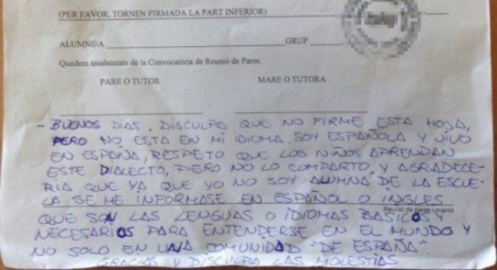El profesor envió una circular a los padres escrita en valenciano y la mujer respondió en castellano con dureza criticando al docente por no utilizar el castellano. "Buenos días, disculpa que no firme esta hoja, pero no está en mi idioma. Soy española y vivo en España, respeto que los niños aprendan este dialecto, pero no lo comparto", comienza diciendo la madre.