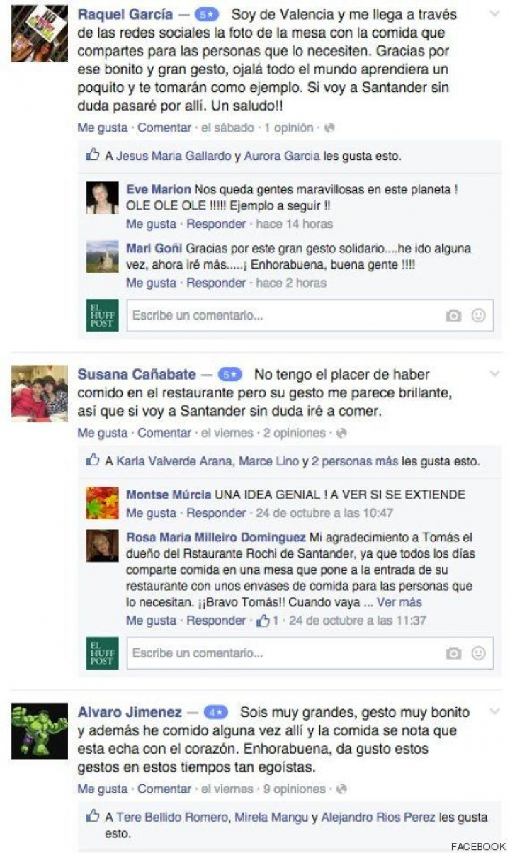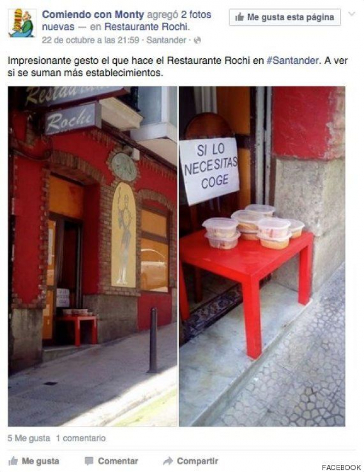 Ellos querían seguir en el anonimato, pero afortunadamente no sólo las malas noticias se propagan rápido. El Restaurante Rochi, en el centro de Santander, ha habilitado una pequeña mesa en la parte posterior del local con envases llenos de la comida sobrante del día. "Si lo necesites, coge", reza el cartel.