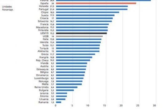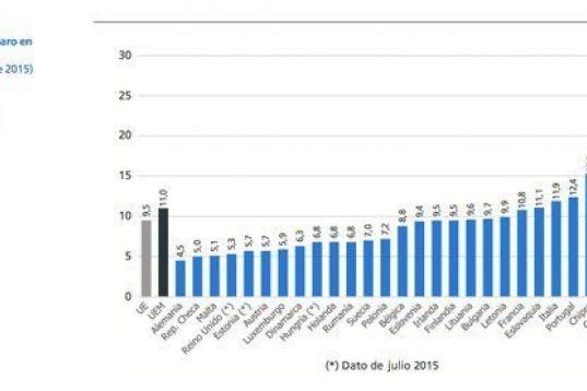 La tasa media de paro en la UE es del 9,5%, mientras que en la zona Euro se sitúa en el 11%. España comparte con Grecia los puestos de mayor tasa de desempleo.