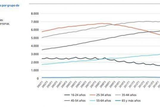 El número de activos en la franja de edad de entre 25 y 34 años no ha dejado de descender desde 2008. Eso provoca un envejecimiento del mercado laboral debido, sobre todo, a la emigración y al desánimo.