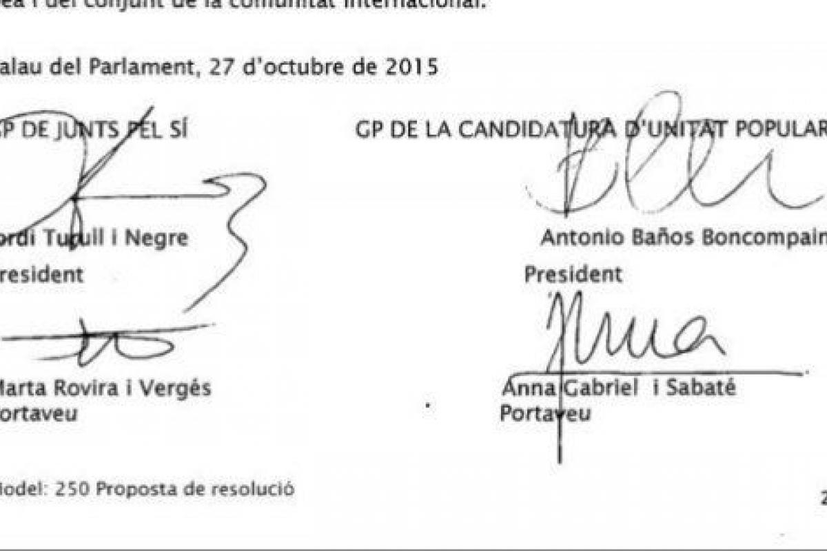 A la espera de la investidura de un nuevo president en Cataluña, el protagonismo pasa ahora por el parque de la Ciutadella. La firma de los grandes documentos del proceso no la pone Artur Mas, quien está ‘en funciones’. La propuesta de resolución para dar inicio al proceso de desconexión de España iba firmada por cuatro parlamentarios: Jordi Turull (CDC), Marta Rovira (ERC), Antonio Baños (CUP) y Anna Gabriel (CUP).
