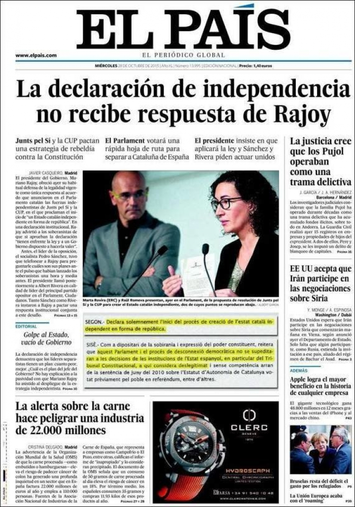 "La declaración de independencia no es un problema de Rajoy, sino de España". Así lo estima El País en su editorial, en el que reparte responsabilidades entre "el asalto de Convergència y Esquerra contra la legalidad... al servicio de la CUP", lo que supone un "golpe al Estado" y "vacío de gobierno" porque "la parálisis del Gobierno es irresponsable en medio de la peor crisis institucional de España" desde "el restablecimiento de la democracia". "Nada tienen que ganar los catalanes, ni tampoco el conjunto de los españoles, con el alejamiento mutuo", concluye.