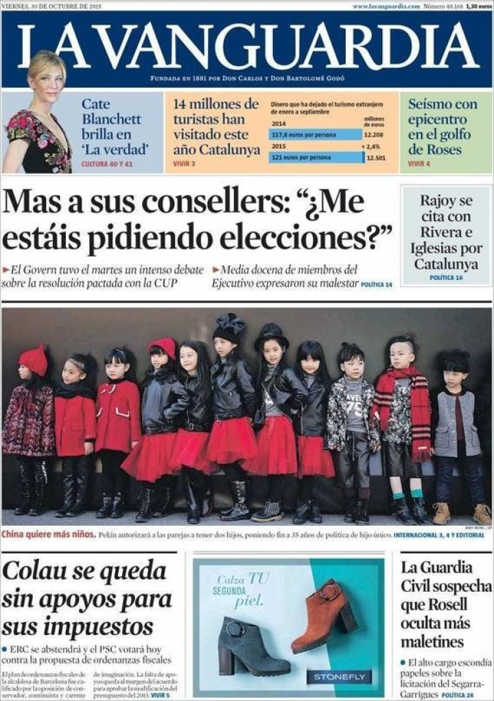 "Colau se queda sin apoyos para sus impuestos", advierte La Vanguardia, porque Esquerra se abstendrá y el PSC votará contra la propuesta de ordenanzas fiscales que consideran “continuista, conservadora y carente de imaginación". En Madrid, "Carmena, blindada con el apoyo del PSOE, baja los impuestos y eleva inversiones y gasto social" gracias a que el pago de la deuda a los bancos será a la mitad.