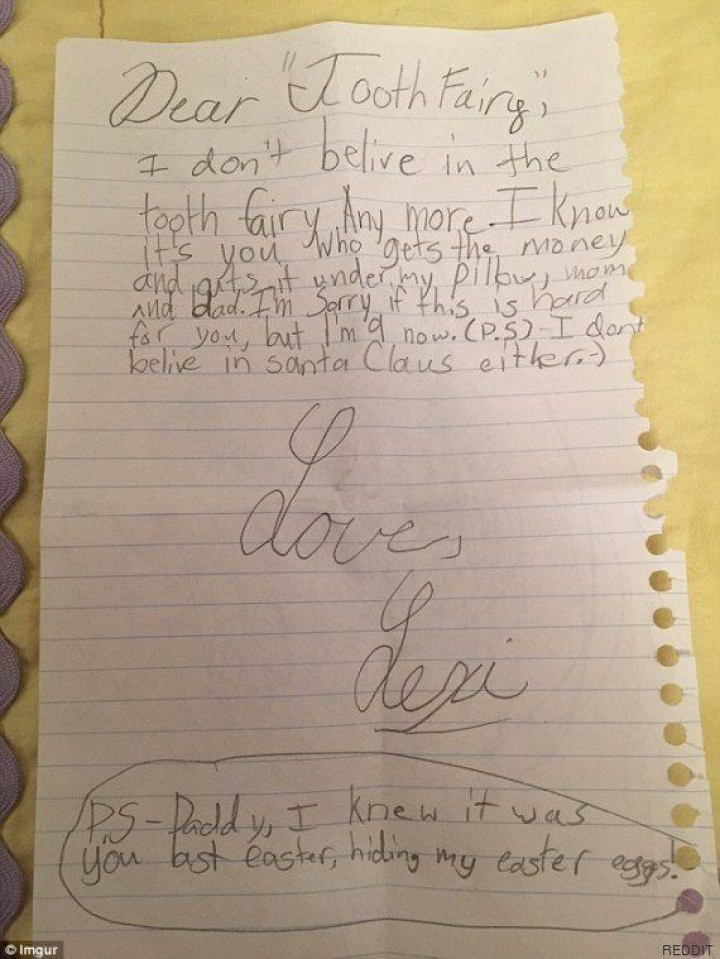 Su padre, identificado como usuario con el nick Willanderson, ha colgado una nota en la que la valiente niña se armó de valor y decidió enfrentar a sus padres. En esa nota dice: “Querida hada de los dientes -el equivalente anglosajón de nuestro Pérez-. Ya no creo en el hada de los dientes. Sé que sois vosotros los que ponéis el dinero debajo de mi almohada, mamá y papá. Siento si esto es muy duro para vosotros, pero ya tengo 9 años”. Contundente...
