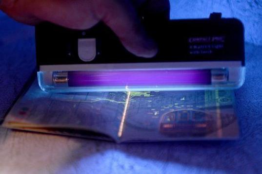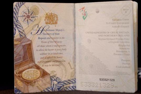 A passport is examined with an ultraviolet light at the launch of the new British passport design at Shakespeare's Globe theatre in London.