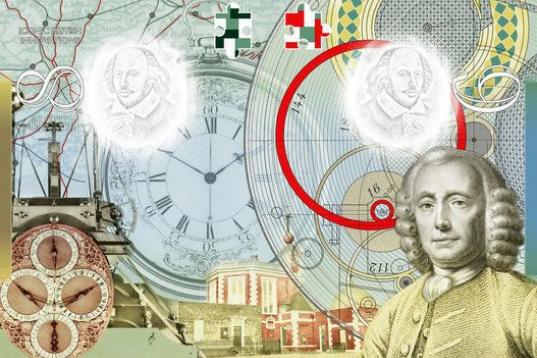 Two pages (featuring John Harrison - Iconic Innovations) from the new British passport design that have been unveiled at Shakespeare's Globe Theatre in London.