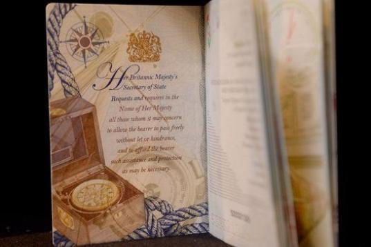 The opening pages from the new British passport design that have been unveiled at Shakespeare's Globe Theatre in London.