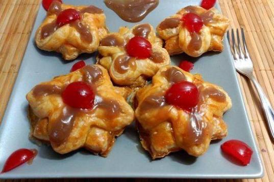 Estas flores son facilísimas de hacer y muy vistosas para presentar como postre cuando tengas invitados. Sólo necesitarás una placa de hojaldre, crema de castañas, un huevo y cerezas en almíbar para decorar.