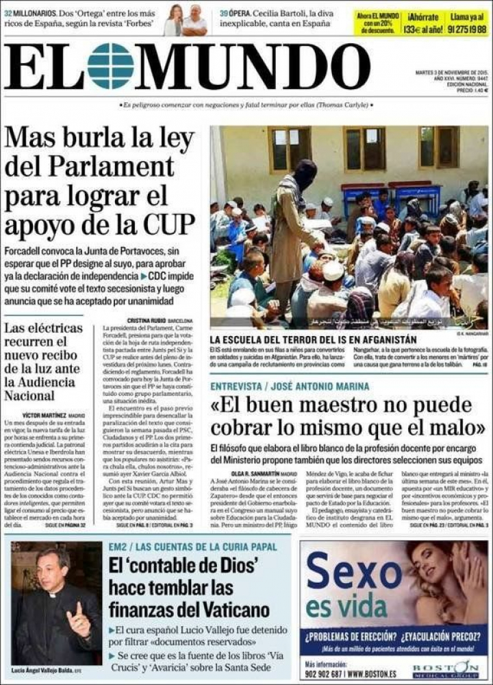 "Cisma en el Parlamento por el pleno de la ruptura", sintetiza en su apertura El Periódico de Cataluña. Se trata de votar la resolución que Enric Juliana en La Vanguardia atribuye a "dos estudiantes de COU con prisas: Josep Rull de Convergència y Antonio Baños de la CUP, y que no aguanta una comparación con el programa electoral de Junts pel Si.